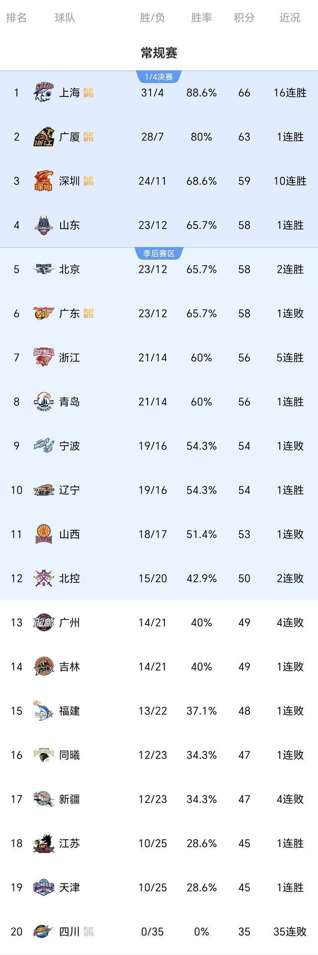 随着广东输山东,北京逆转同曦,广厦结束2连败,CBA最新排名如下